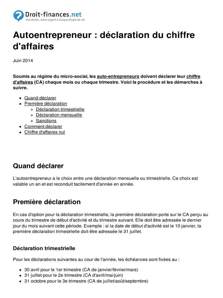 L'auto entrepreneur et micro entrepreneur fournit, mensuellement ou trimestriellement à l'organisme compétent une. Savoir quand et comment déclarer votre chiffre d'affaires et payer vos cotisations. Tout auto entrepreneur a pour obligation de déclarer son chiffre d'affaires. Capture d'écran du site autoentrepreneur.urssaf.fr : Voilà une question qui revient tout autoentrepreneur doit obligatoirement déclarer régulièrement son chiffre d'affaires, même s'il est nul (zéro euro), et avant les échéances prévues.